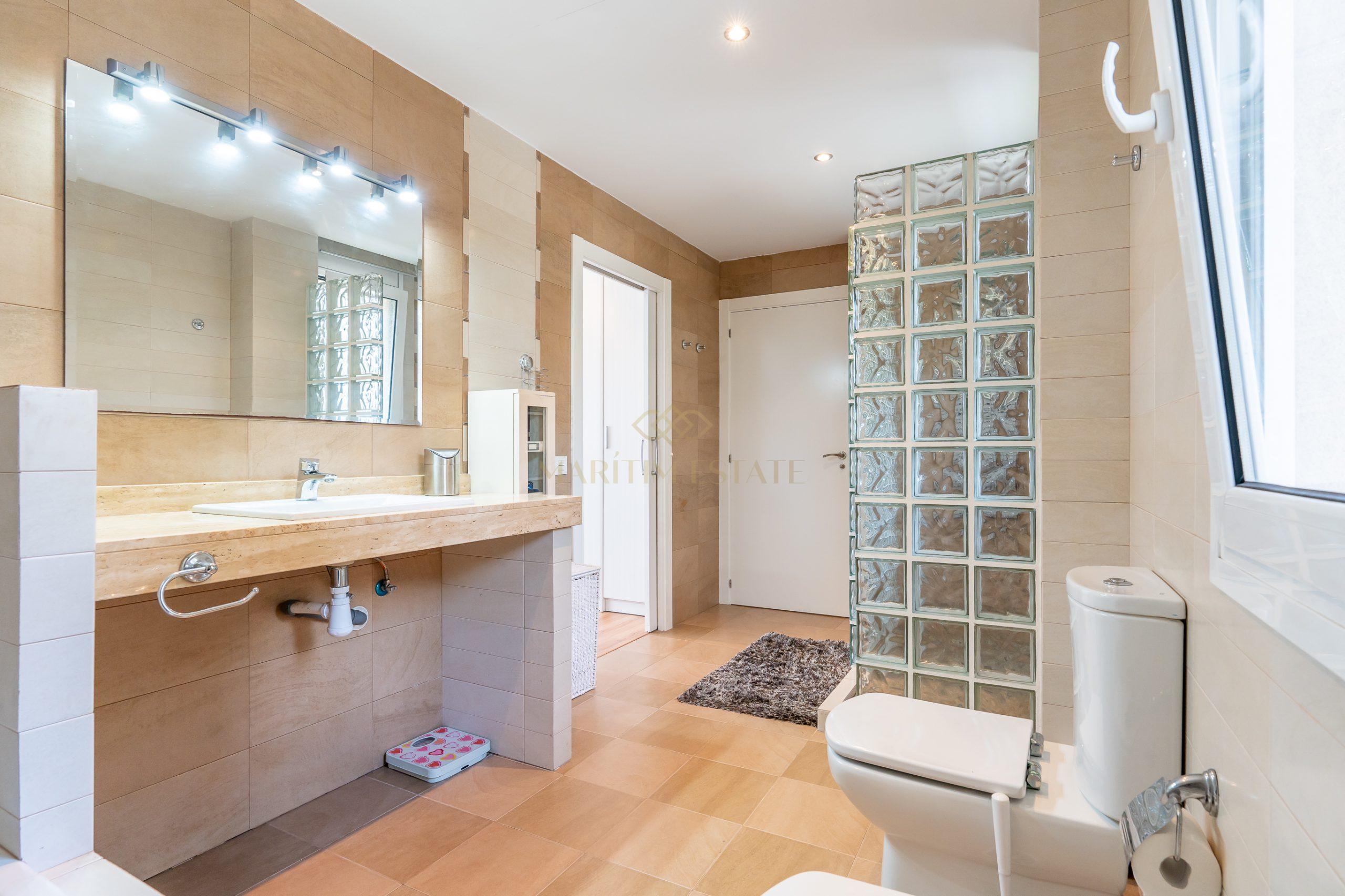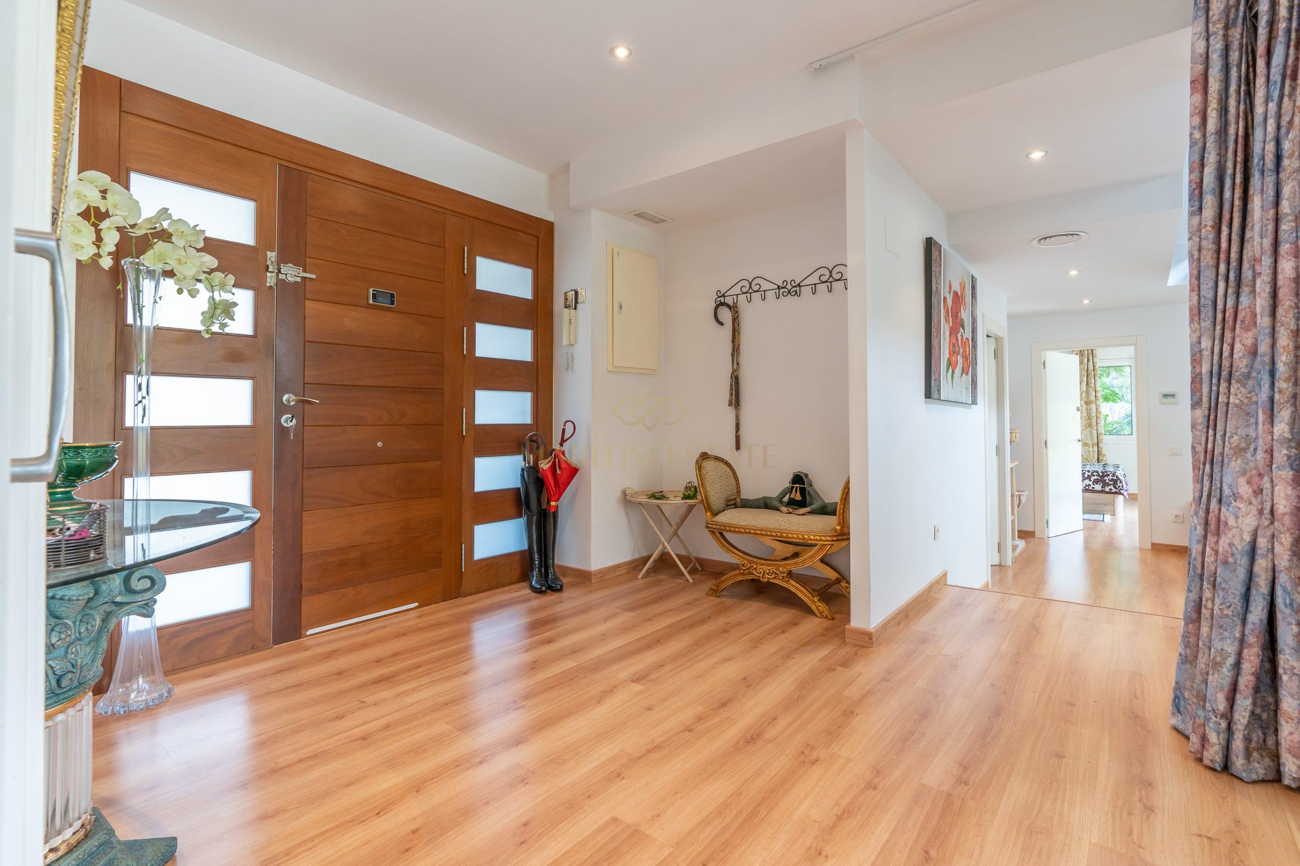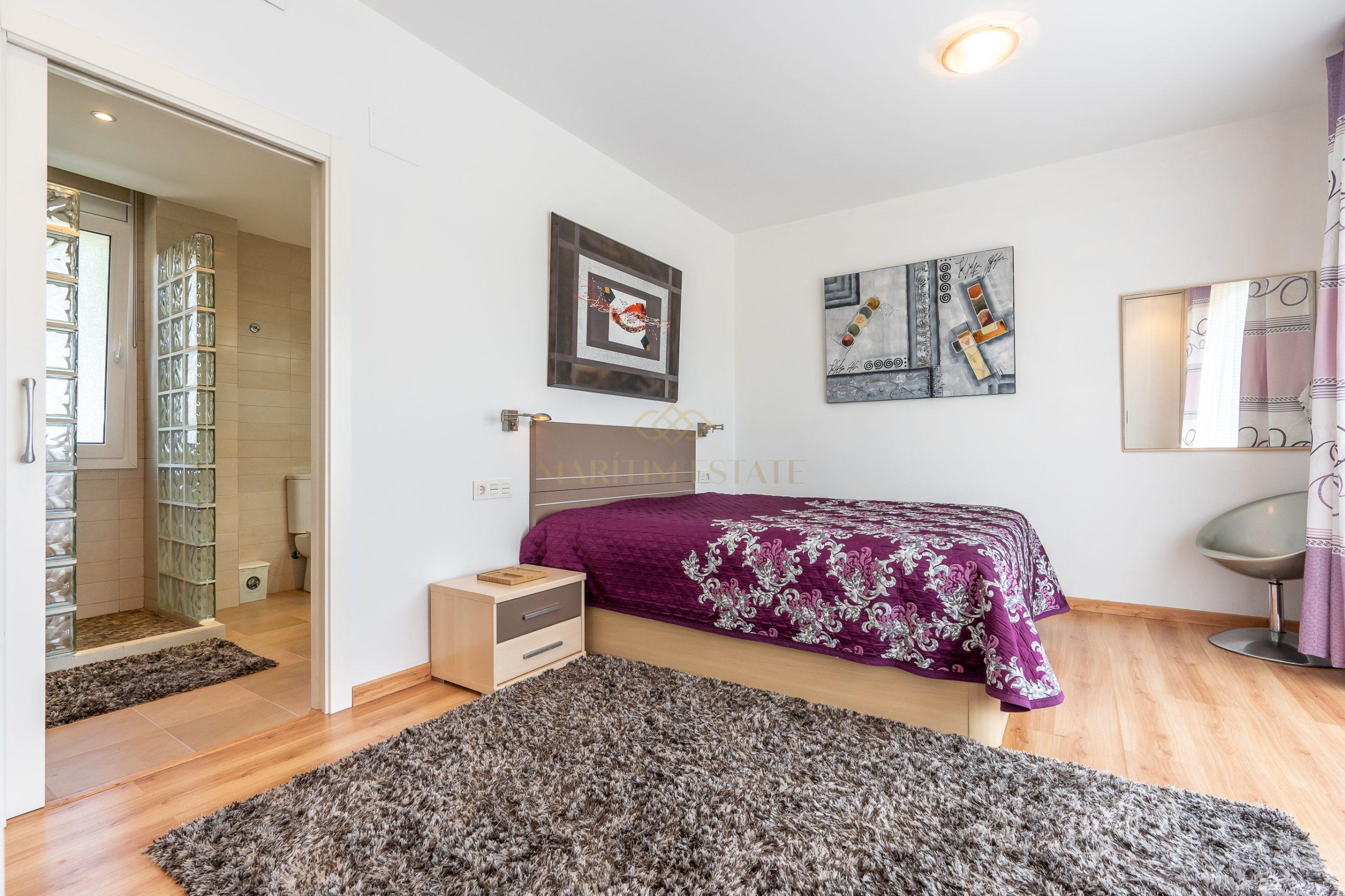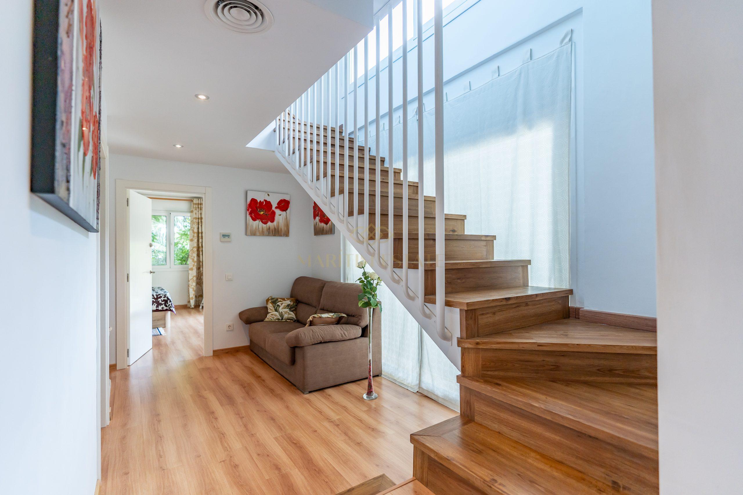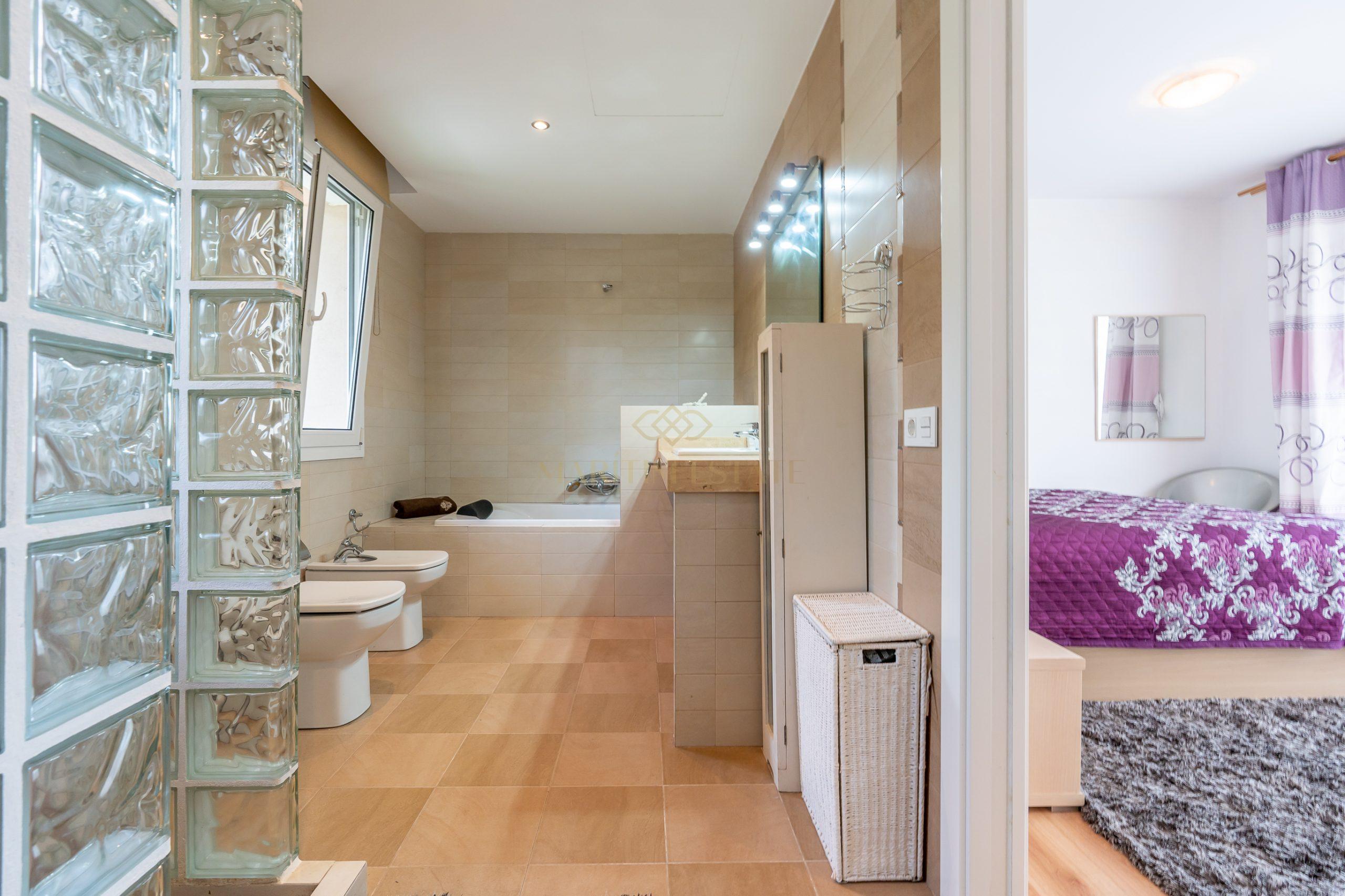 The second part of the house, separated by a large hall on the first floor, includes two double en-suite bedrooms, one of which has direct access to the patio. On the second floor, there are two more bedrooms that share the same bathroom.